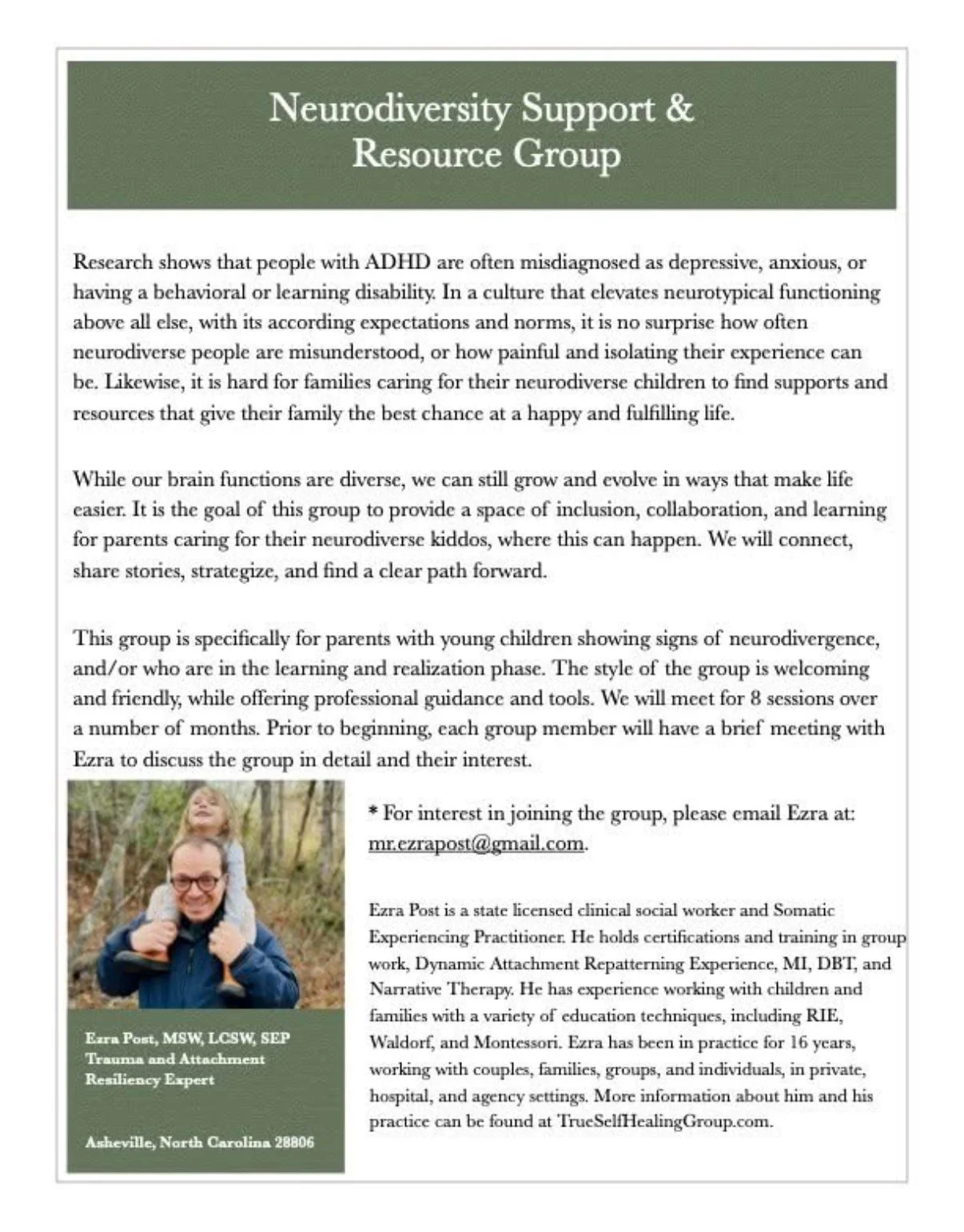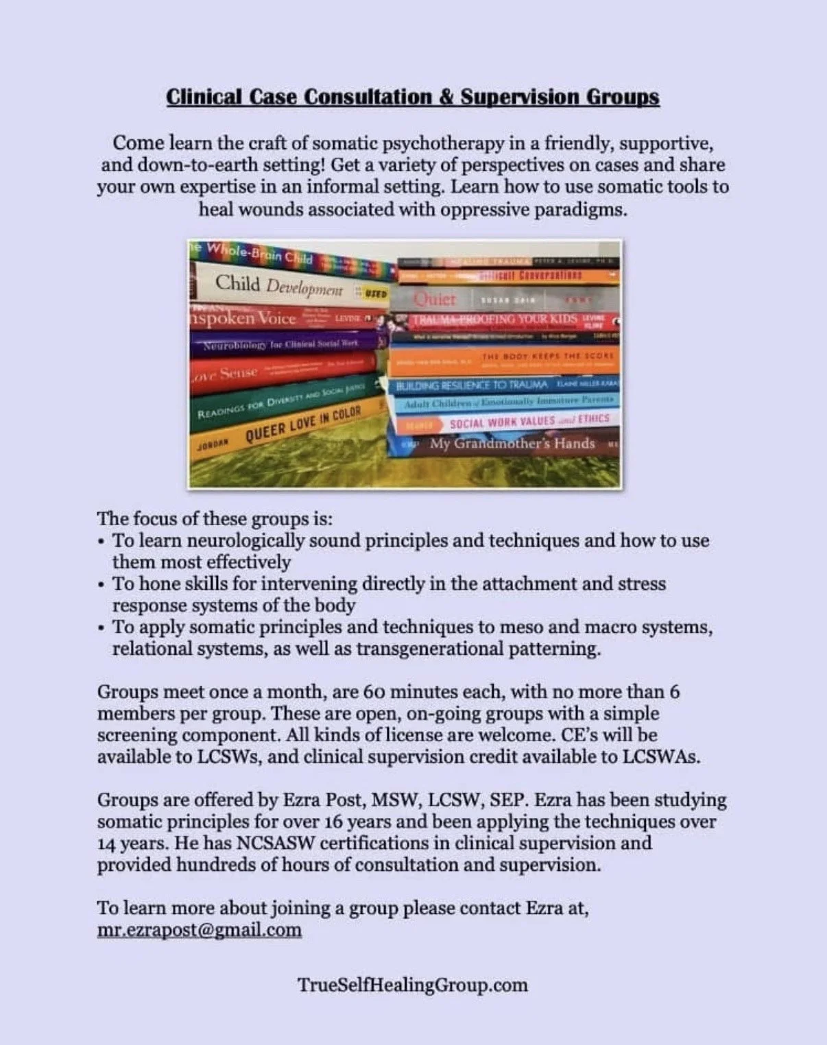 This is the practice website for Ezra Post, MSW, LCSW, SEP, somatic psychotherapist, trauma and attachment specialist, and the home for life-giving resiliency and joy! Through evidence-based, somatic practices, for healing trauma and attachment wounding, you may access the balance and clarity you seek for a more fulfilled life. Here, all are valued and all are welcome.